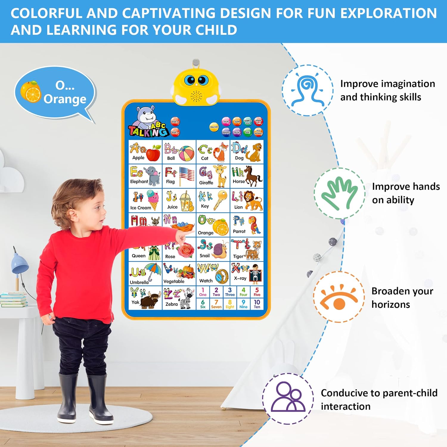 - Preschool Learning Toys: This talking ABC & 123s wall poster is the perfect learning tool that is interactive and tactile. Best feature is that speaker activated by touching the picture, letter, or number instead of a speaker “button”. Educational toys not only bring your kids’ hours of fun, but also help them get a head start on numbers and letters