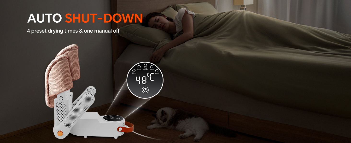 - Smart Timer This boot dryer for the jobsite has a timing and constant temperature function to prevent over-temperature drying from causing damage to shoes. It can set different working times for different types of shoes, which easily reduces energy consumption. Say goodbye to wet and uncomfortable footwear with this easy-to-use dryer! Timing gear: 30min, 60min, 90min, 120min, or unlimited time.