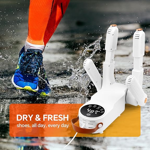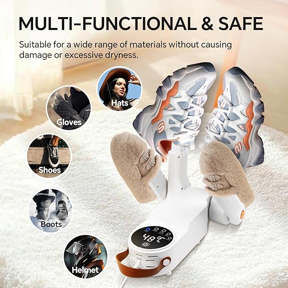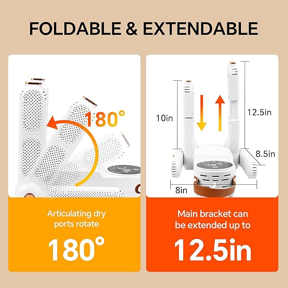 - Quick Drying : This shoe dryer and deodorizer uses convection technology to push slightly warm air through our specially designed dry ports to quickly and quietly dry your footwear or equipment. It adopts 360° hot wind circulation design, so that the inside of the shoes can be dried evenly to prevent partial drying, which can effectively remove moisture, sweat and odor from shoes.